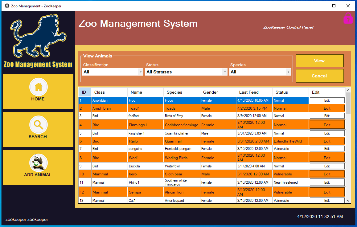 - view animals by Class, Status, and Species.
